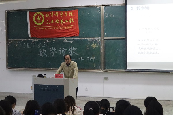 2022年11月2日下午,投注免费游戏 在九号楼202教室举办了三五培养工程之数学诗歌活动,本次活动的主讲人是投注免费游戏 徐伯华副教授,260位学生聆听了讲座。