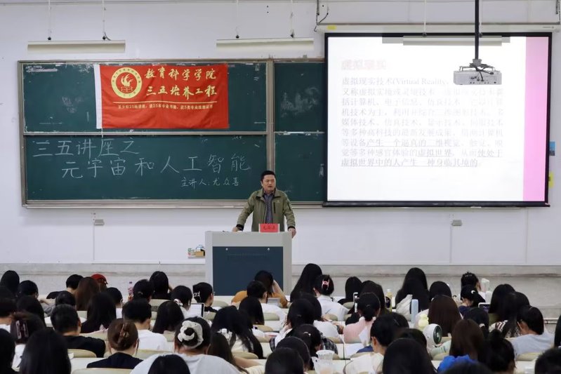 元宇宙与人工智能逐渐崛起,机遇与挑战相伴而来。为了让大家了解前沿科技,提高大家的创新能力,投注免费游戏 于10月25日下午在九号楼201教室举办了以“元宇宙与人工智能”为主题的三五讲座,由教育技术系尤众喜老师主讲,投注免费游戏 260多名同学参加。