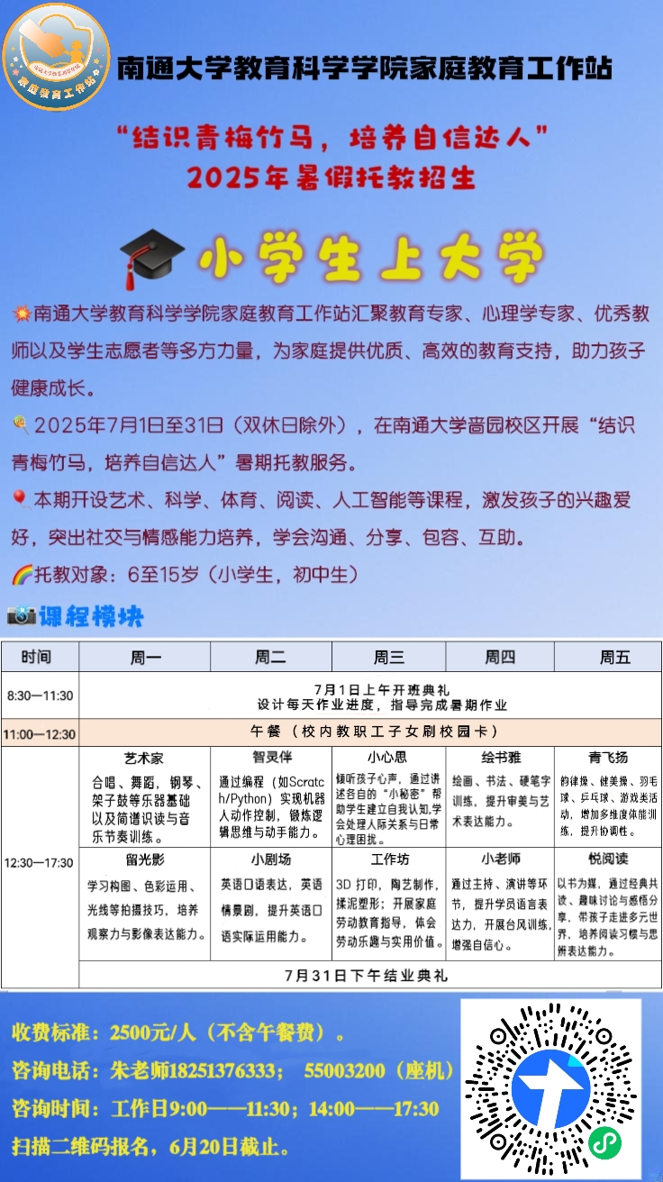 时间地点:2025年7月1日至31日(双休日除外),在投注免费游戏 啬园校区(啬园路9号)开展“结识青梅竹马,培养自信达人”暑期托教服务。