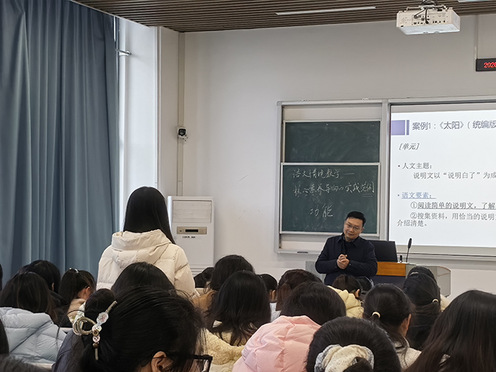 3 月 17 日上午,投注 教授公开课暨课程思政课展示活动如期开展。陆平教授为 22 级小学教育专业 100 余名乡村小学定向生,执教示范课《语文情境教学 —— 核心素养导向的实践范例》。