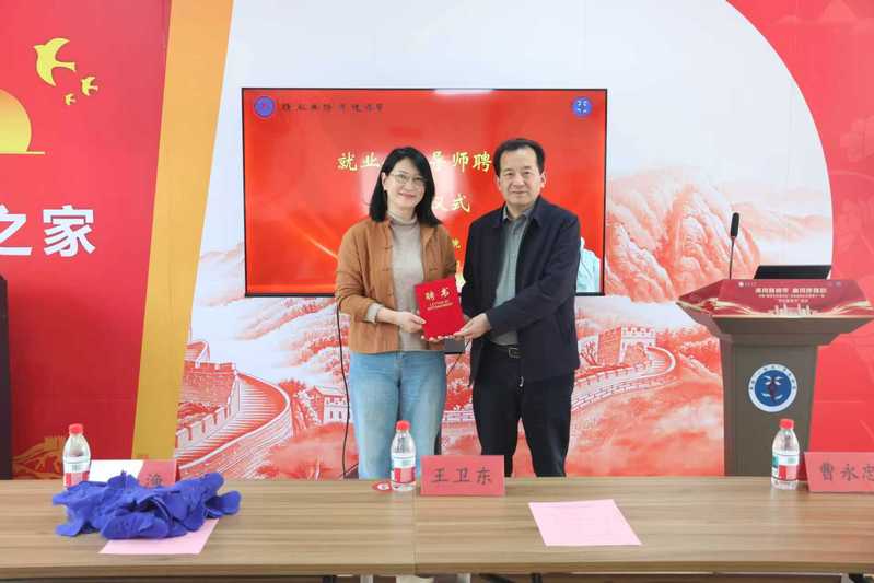 活动现场,王卫东为李小渔颁发投注 就业创业导师聘书,曹阳为其颁发投注 学生成长导师聘书。