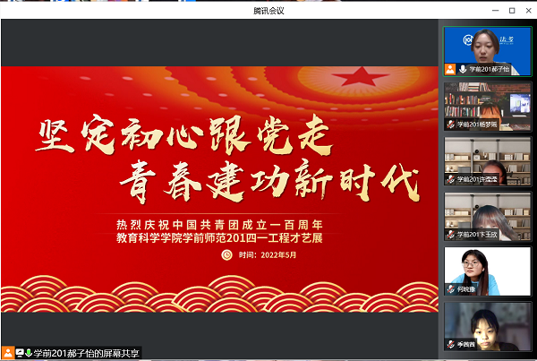 2022年5月20日,学前教育201班在腾讯会议举办了以“坚定初心跟党走,青春建功新时代”为主题的四一工程文艺汇演活动。班级31名同学全部参加。